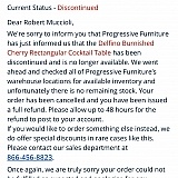 Horrible service and support. Company directly lied to me in an email. Ordered a product that was in stock and was notified 4 days later it's discontinued, after already receiving and putting together a matching end table. Was sent an email by 1stop saying they would offer a discount on a new item I wanted to order. No one from the company would honor the email that was sent to me! Called them for two weeks trying to speak with a mananager and told there was a 72 wait time and he/she would get back to me. After checking in multiple times, still I never got a rely from management after two weeks and was still told I would not receive any discount. What a waste of time and stress. Along this whole process I was also treated rudely by sales/ customer support. Would never recommend buying from here. False information on website and company lied in a email to me... unacceptable