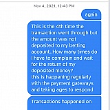 This is the 5th time the transaction went through but the amount was not deposited to my betting account. How many times do I have to complain and wait for the return of my deposited money?