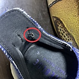 Cloth of one shoe has been damaged from 2 locations and some metal like object from inside is biting my toe and wounding me. Pictures attached.