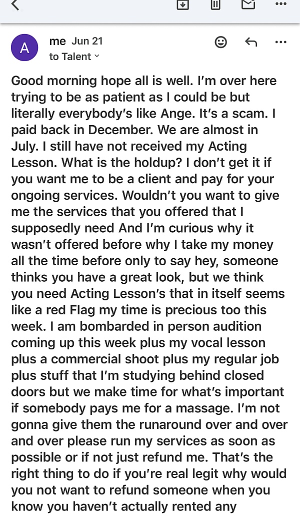 Jessica And her AdorableTalent team are scam artists. First off she charged me 450 for the photo shoot, that was supposed to include hair and wardrobe. Well the only thing see did with the hair was use her hand to lay it down, then she only brought two outfits that didn't fit. My daughter had to squeeze into one of them and use her own outfit that she came in. She was late to the shoot, and can you really call it a shoot without all the proper equipment. Then I was told the pictures were going to be up on the site for me to view, I didn't see the pictures till two months later and I was very disappointed in them. Mind you I asked for my money back before I even seen the pictures because I wasn't satisfied with how the photo shoot went, and how long it took her and her team to respond to any questions I may have. Now we never signed a contract and their was no receipt given saying that I couldn't be refunded if not satisfied so I'm still waiting on my 450 dollars that she's going to different countries and spending it on instead and not getting my child no work.