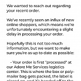 Thank you for taking the time to write this review. We are very sorry for the difficulties that you have encountered. Indeed, delays are highly regrettable, especially that this is not the kind of service that we aim for, neither the impression that we want you to have towards Adore Me. We always wish to ensure a great customer experience and minimize any discomfort as much as possible. Even so, just like any other company, we do this by following certain internal policies that have been put in place to efficiently help our customers. I took a look at your account to better understand the issue and I could notice that you were already assisted by our customer service. We always guarantee assistance whatever may happen to your package.