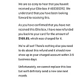 Ok so I received an elite box nothing fit right and it took forever to get to me the delivery date changed 3 times before I finally received it then I quickly returned it everything in the bags just as they sent me and they said that the returned items were not returned in same condition and charged me another $40 after I had already cancelled everything which is a task in itself but after 6 emails and 2 phone calls to them I thought I had it taken care of but now they want to charge me for items I returned this is a horrible company but I did finally get my money back after calling and getting hung up on