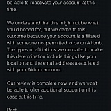 My account was banned due to being associated with somebody that Airbnb said it was not allowed on their platform. I was provided no further explanation. I've had no complaints from host and have used the platform for years and was removed without causation. I am a law, abiding Citizen, who is respectful of all my host and their domains, and was removed from being able to use these services due to an association that I am not even aware of. This company discriminates without cause and unfortunately feels no repercussions of it. It's exclusionary, it's discriminatory, and it is without basis outside of vague associations. I encourage anyone to hire legal representation that has been through similar encounters.