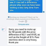So peed off. I canceled the order and lost 2.95% of my payment to a Alibaba transaction fee which as far as I'm concerned Rose Tong should have been made to pay. And that's another thing. There is no Help page, you can't make a complaint. You can only apply for a refund.