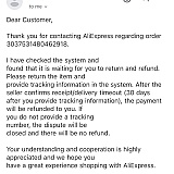 AliExpress's scheme is simple: return the item at the seller's expense only if he agrees to pay. If not, you're stuck. The chatbot repeatedly told me to pack and ship the item with a tracking number, ignoring the seller's refusal to pay.