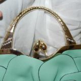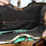 The handbag/purse has heavy gold hardware for a handle that is engraved and also has 5 crystal like gems on each side, loop to attach the strap, also on the strap to attach and the oval snap to open and close. Once you open the purse it is lined with a chocolate brown fabric. You have a small zipper pocket, a smaller compartment, another larger zipper pocket, and a VERY large compartment along with 2 pockets that are lined with the mint green leather which is the perfect size for your glasses & phone.