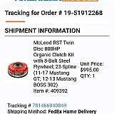 Saturday came no package. They blamed it on the shipping company and didn't know where or when my clutch would be delivered. So didn't get my car fixed before I left and they only gave me 20 dollar credit to use next order. Clutch finally arrived that Wednesday while I was gone.
