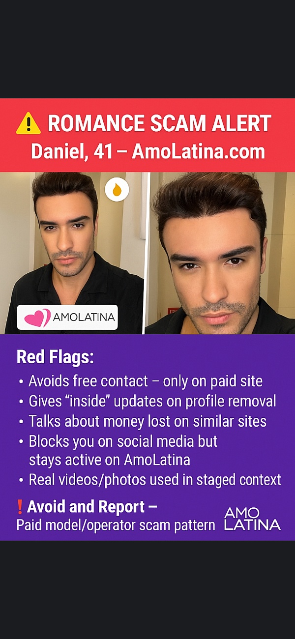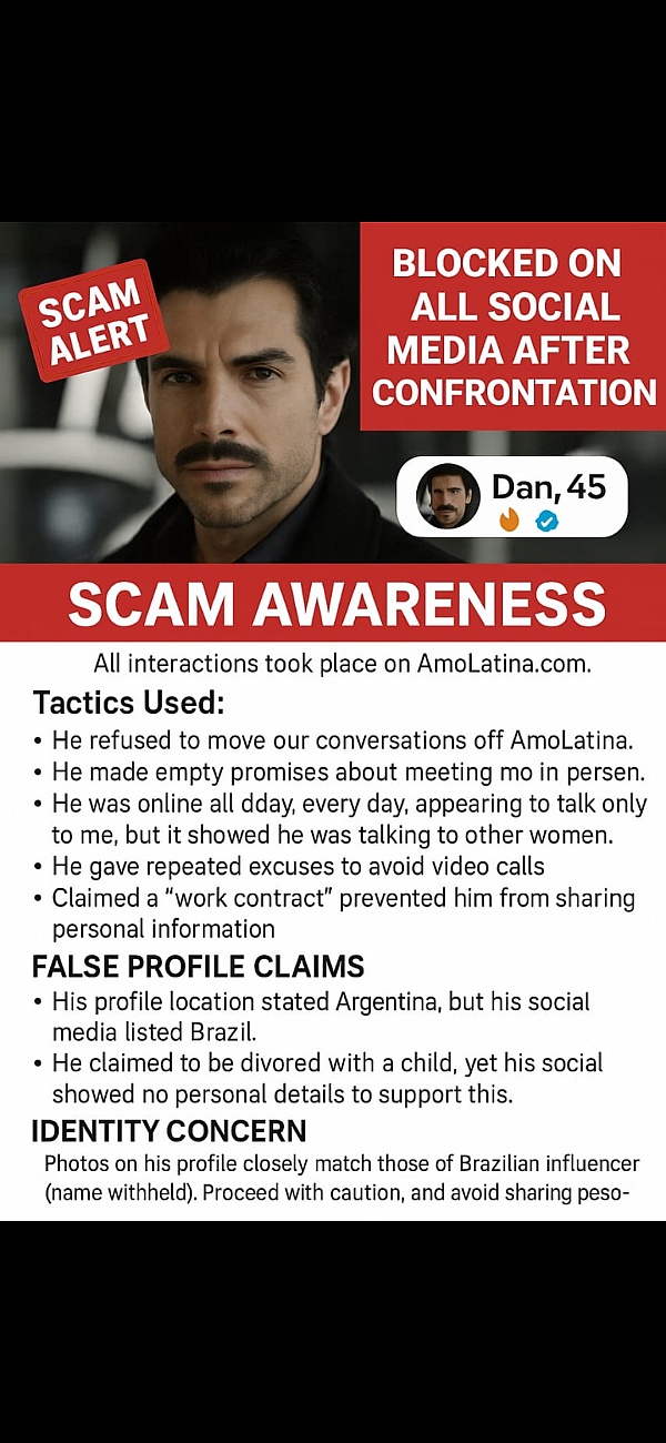 I interacted extensively with two "verified" and "popular" free users on AmoLatina.com named Dan, 45 and Daniel 41. These profiles display both a blue verification badge and a flame "Popular Member" icon, yet: Refused to move conversations off AmoLatina, ensuring all messages cost credits. Made repeated empty promises about meeting in person. Were online all day, every day, chatting with others despite claiming to only speak to me. Gave excuses to avoid video calls, claiming a "work contract" prevented sharing personal details and also both kept promising to share contact details soon. This was never their intention. They are models payed to make money for the site by keeping women who are paying members, to keep buying credits One claimed to live in Argentina, but public information showsled Brazil. The other claimed to be in Brazil but was actually in india, and then China as shown by their social media. They blocked me on instagram and facebook to keep communication only on the dating platform, for financial gains for themselves and AmoLatina.com One claimed to be divorced with a child, but his social media showed no children of his own — only other family members. When I raised these inconsistencies directly to him, he blocked me on Facebook, Instagram, and his business WhatsApp, after previously being connected there. The other profile daniel 41, also lied, manipulated and displayed narcissistic behaviour as well as inconsistencies. I reported all of this to AmoLatina, which advertises that it "takes marital status and children seriously." Despite the evidence, they refused to investigate, citing "privacy policy." Financial impact: