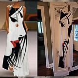 The long white dress with the face has a white rib around the neck and the arms. The advertised piece has no ribbing. It is NOT made from cotton.