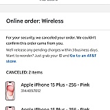 I placed an order to upgrade 2 lines on 12-26 with a promo for an iPhone 15 plus with no trade in for 5.99/month. They cancelled the order because I had to upload my ID. I placed the order again last night, uploaded my ID it said everything was confirmed. Checked this morning and they cancelled my order again! Now the deal is no longer available. Go figure, right. They suggested I pick the phone up in store, which I would have loved doing. However, there were none available within a 40 mile radius of my location. I spent at least 2 hours talking to reps, chatting online, or sitting on hold to find out that they will not honor the deal from yesterday, but could let me get the phone for 14.46 a month, and have to depend on them issuing a credit each month to offset the overage amount…. For two phones. There's one guy at a store close by my house that might be able to fix this for me. If he cannot I'm so done with this. My account is over 20 yrs old, and it means nothing to you there at AT&T. Maybe t mobile or spectrum could better appreciate a loyal customer. I'm pretty sure I can get service for $95 a line almost anywhere. So sad ….