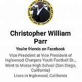 AT&T technician and Vice President Of Inglewood Chargers Youth Football Organization, Christopher William Parr, 1-31-1964 -*******447) retaliated against a mother on FB over a comment she "liked" about somebody named Brinona Taylor. In his own words as shown in the image he told her he searched her FB page and found her address on Google and threatened to shoot her "small child". When I confronted Christopher in FB messenger he went off on me in an angry hate filled, radical racist rant in which he wrongly assumed I was White, I'm not. He also went on to explain that he was avenging the death of Brionna Taylor and his cousin who had been shot by the police 12 times. I have images of the entire documented text exchanged saved. I have also sent this image of the death threat out to numerous media outlets in the Los Angeles area and have alerted all law enforcement, local, state, county, and federal. I can be contacted any day after 1:00 PM Eastern Time if you have any questions or need any additional information including images in Christopher William Parr's own words. Image of death threat and other photos for identification uploaded below.