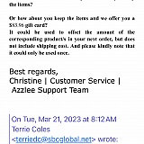 I would have been satisfied if Azzlee had offered a full refund or exchange, but they offered me 20% and said I could keep the garment. What good is that if it doesn't fit. When I tried to reject this "offer" all additional emails came back as 'undeliverable', so I contacted PayPal for resolution and got a full refund.