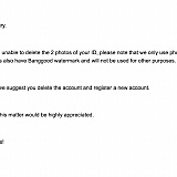 "We are sorry for that we unable to delete the 2 photos of your ID, please note that we only use photos to check whether it is the person, the photos also have Banggood watermark and will not be used for other purposes. Please rest assured."