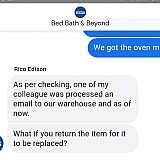 Then I have to contact them 7 different times trying to get them to ship the pieces to me. They say they will. I get a reference number. Half the time they dont even type full sentences and when you call they don't know what to do. After a month of this the last person I spoke to made no sense, told me there was an order put through for me but then told me I should just go in person and exchange the item. Really? Now I have to go out of my way to do an in person exchange when I paid for shipping for a reason. My entire family and I will no longer do business with this place. They just lost 14 customers. I attached an image of one of the examples of the incomplete sentences they responded to me with.