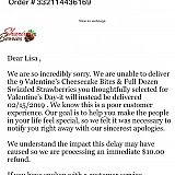 Ruined my fiance's Valentine's Day. Ordered days in advance. Promised it would be delivered on Valentine's Day before 6:00p.m. I received an email@ 5:42 p.m. on Feb 14th stating that it would be delivered on Friday Feb 15th (which has yet to be delivered). VERY POOR CUSTOMER SERVICE, UNPROFESSIONAL & LACK OF EMPATHY! BAD BUSINESS! I will never order from Shari's Berries again (in fact I was a 1st time customer) & by the looks of their reviews A LOT of other people won't as well...