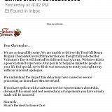 I spent $103 on my Order. It was a surprise for my husband for Valentine's Day. I placed my Order on Feb 7th. I had no idea there would be a problem. It wasn't until 5:45 pm on Valentine's Day I was notified my Order, my Valentine's Day gift to my husband, would never be delivered. Their solution was to give me a $10 refund and ship them on Feb 15th! I spent $17.99 on regular shipping, $14.99 for morning shipping on VALENTINE'S day and $9.99 for guaranteed Valentine's Day delivery. I couldn't get through by phone to customer service and they never responded to my emails to their customer service. Please... don't let give them your business and hard-earned money. They don't deserve it!