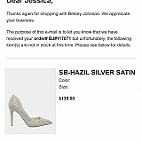 I ordered 2 pair of shoes. In august. One pair was delivered. I paid in full for both. $286.75. The Vincent silver shoes was back ordered till Aug end. Ok. Then was back ordered till sept 29. I was never sent an order shipped email. So I contacted them and only then was I sent an order shipping tracking number. Well it was invalid thru Airterra. Airterra was very helpful explaining obviously betsy johnson never gave them the merchandise. Betsy Johnson said yes we did. And again I tried to get an honest answer as to no avail we mishandled your PAID for shoes. To no avail. So disappointing. Betsy johnson…. She should be appalled she's still associated with this her name on the line. I will NEVER…. EVER order from them again…. I'd rather to go Dillard macys anyone else for shoes …. You should be ashamed betsy johnson….
