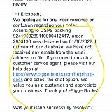 The email from Bigger Books provided a link to click on to submit feedback about our order. I responded with this link, order number, problem, etc. twice. It tells you someone will get back to you within 24 hours. That never happened. Apparently the link provided by Bigger Books for feedback doesn't operate properly.