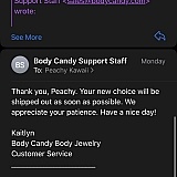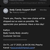 I was really concerned about my $50 in jewelry given all these bad reviews so I wrote a very Karen-y email to Body Candy basically asking where tf my package is at. I really wish I had not. This is a good company, they are just busy. I ordered on July 31 and I received my package 13 days later. Not to mention, I received a response from a very kind customer service representative the very DAY AFTER I SENT IT. I've never received a response so quickly from a company, ever! Everything is delayed, but I received my package in under two weeks still && the jewelry? STUNNING. These nipple rings are to die for, can't wait to give em a whirl. Please don't hesitate to purchase from here. A+++ will buy from again.