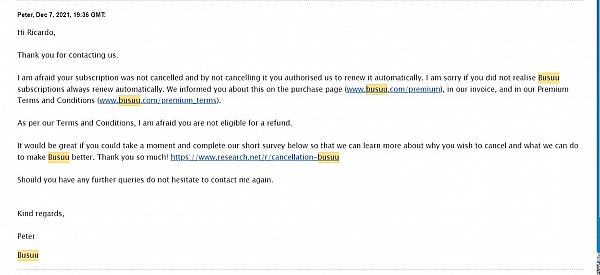 To be honest, I enjoy using Busuu... but this approach and their rude customer service has left a bad taste. I will be cancelling my subscription in the future and next year, will be looking for a learning tool with better morals and customer service,