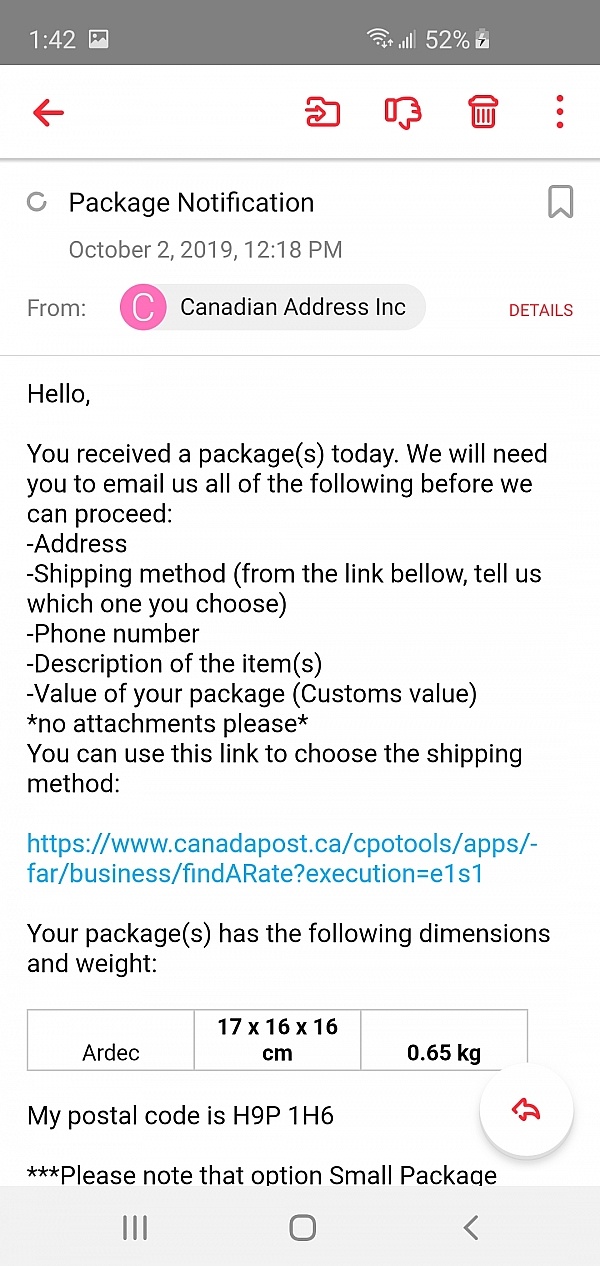 I have used Canadian Address several times so far, and they always provide me the quite satisfied service every time. As they reply to me via email promptly and act sincerely, their forwarding service is very reliable.