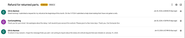 The part came quickly although there was no confirmation email when I ordered or when it shipped. The part was not what I needed, so I returned it. I have not received an email confirming that Car Computer Exchange received the part, but I do have a FedEx confirmation that it was delivered. My satisfaction will be determined on how the return process goes.