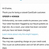 I used to love this site, but now they just keep flagging my orders as "fraud" immediately after purchase. It doesn't matter what size gift card I buy or which credit card I use to purchase it, they cancel everything. I even tried creating another account, and the orders were canceled on that one too. I contacted customer service and basically just got a we're sorry your order was canceled message. When I pushed them for actual help, they just suggested I try another card, something I already tried multiple times. Then they said they wouldn't give me any more help. In a nutshell don't even bother using their website they cancel legitimate orders and then won't even fix their system's issue.