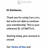 Answer: This is so sad! I have been on both sides as I have an assisted living home in Pensacola Florida. I used care.com to staff my home; awful. Then when I had myself on as a provider they suspended me for a 14 year old non viloent misdemeanor, and they did not even have my permission to check past 7. They want you to get crappy providers, the good ones are kicked off because once ya get a good one, you no longer need them. Cash cow corrupt company who makes rules up as they go along, I heard 20/20 is doing a special. I plan to contact them, as I am verifiably the best care coordinator hands down, extremely good with direct care. You will only ever be returned 1 month contact the Federal Trade Commission file a complaint that's what I did, the more problems the better the case against care, com