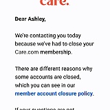 Care.com took my money and immediately closed my account preventing me from using the subscription I paid for. To make matters worse they have Terrible customer service, refuse to make a phone call to me and do not respond to my emails. Stay away, use somewhere else.