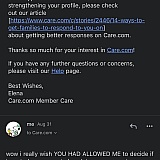 Hi Tar, Hi Tara, I'm sorry to hear your feedback on Care.com. We'd be happy to assist you if you want to reach out to us through our Help Center's contact us form found at help.care.com. You can also reach out to us through our Facebook Messenger. Please include Reference Number REV-016595 with your message.