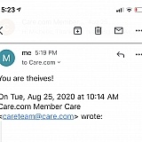 Care.com is a terrible company they are liars and they are thieves. I paid $173 for a membership through iTunes and because I had the same name as my cousin they shut my account down and then refused to refund my money when I ask them to refund my money they said go to iTunes when I went to iTunes iTunes said I had to go to Care.com. They are thieves and I would never ever ever use them. Plus the people on Care.com lie about who they are and Care.com supports them and when you write a review and you tell people about the people on Care.com they shut you down. I'm really serious it sounds like it's a democrat run company