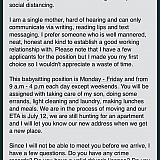 Answer: I would be cautious. I hope she is not moving for the job, as that is NOT a good idea. I get text messages daily from people asking me to email them (often for a friend), or someone coming from out of town or whatever. I delete these right away. First of all, they should go through the regular website and email you. No one would hire anyone without first meeting them, checking references, etc. I am sitting at the home of someone I took with through the Care site. I first communicated via email, then set up a face to face and met the kids. If it seems too good to be true, it is. USE COMMON SENSE! Seriously, if you don't have common sense you really shouldn't be taking care of kids, pets or anyone else!