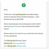 Hi Victor, Unfortunately you've published some inaccurate information about Caring.com's reviews program here. There are close to 30,000 negative 1-star and 2-star reviews published on our website right now. Those reviewers were able to submit their negative feedback without slandering a home health care agency and its employees with offensive content such as using slurs or name calling (all of which is outside our review guidelines). The content we received from you had multiple issues that prevented it from being published, and we'll definitely follow up with you to provide those specific details. Inside that decline notice you posted a photo of: it shows that we invite you to contact us if you have questions about why we declined the review. I searched our records and I found you didn't contact us to ask us why your review was declined (we did receive a message from you this morning with a different request, and we'll be following up with you directly to address that as well). We are not partnered with the agency you reviewed on Caring.com - we are not in their "hip pocket", and advertising is not considered when we process reviews (we don't take "kickbacks" in our reviews program; there is no way for a business to pay us to decline or remove reviews). We run a high-integrity consumer reviews program, and that includes having some standards about the content that can be published on our site (those guidelines are public facing and linked right from the review submission form). For anyone reading this who wishes more information about Caring.com's reviews program, do not hesitate to contact [email protected]. Thank you!