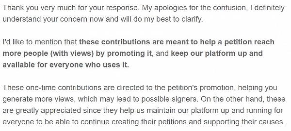 To my big surprise, my friends receiving the petition informed me that the website was asking them to donate money! (I never received that information entering the "my petitions" section...)