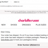 I placed two orders. The first one I received a tracking number within 3-4 days. The second order I placed a day after the first one. I waited 4 days before contacting them. No response. I received a shipment delay email from Paypal. I waited 6 days, tried again and got a tracking number from Charlotte Russe. It had a shipping label created days prior. It still has not updated by the 8th day. I get a partial refund through Paypal. Customer support has NOT explained what was going on. I get an official email from Charlotte Russe that a dress I bought was out of stock. I get another email for the partial refund. With a huge list of items that suddenly became out of stock. Like the others, I see that some of these items are still up on the website IN STOCK. I have contacted Charlotte Russe through emails and twitter. I finally got a customer support email response that was generic. No explanations and ignoring my questions. I have repeated my questions and I'm not expecting a response. Lost my business for good.