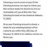 Following a recent review of your Checking Account, we regret to inform you that we have made the decision to end our relationship with you at this time. Your Checking Account will be closed on January 27,2023.