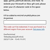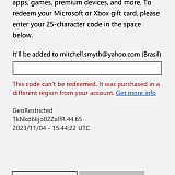 Told customer services about my problem. They informed me that the VPN I need to use should be a premium VPN to change my IP address to the desired country in which the code works in, and then my code should work. So I then made the additional purchase of the premium VPN, and tried all the different regions they told me to try and still my code is not working. I once again informed customer services about this and now to top it all off they are ignoring my emails.