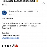"Our next shipment is expected to arrive next year. Production is very slow for the All-American". I have tried to contact them again and now their email at customer support at *******@cookstore.ca no longer exists and Cookstore.ca website now directs you to a different business ChefSupplies.ca where they can continue to take peoples money! Save your money and some grief and order from a different company. I have filed a charge dispute with my credit card company and will have to wait to see how the investigation goes. Over a year and no canner or even a committed time when I will receive it. Lesson learned- if you can not get any commitment for a date when they will fulfill their order something is wrong. New company Chefsupplies.ca. Think twice about ordering here too.