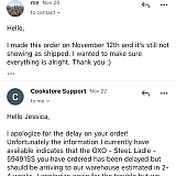 I made an order on Nov 12th, got an email confirming my order and the charge was taken on my card. It took them almost two weeks to give me any other sign of life, and only after I emailed them first, asking them what was up. It's at that moment that they told me one of the items I ordered was unavailable. I agreed to an item swap, and was told that my order was in shipping and that I would get a shipping confirmation soon. That was about 3 business days ago.