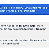 I reached out to customer service via chat and sent photo screenshots and a video recording of the website options I saw on my end when customizing, showing the option to add grommets was missing. I was told to "view the page in desktop mode instead" like that was something I knew I had to do in order to ensure I had all the customization options to pick from. What? That's the response? That's the customer service? It's my fault I didn't have all the options visible to me because of how I was accessing the webpage?