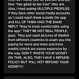 Full of fake profiles ((popular member) as models that keep sending msg ( even if you dint reply) like desperate ajajajjaja asking you stupid things, and showing you as they were interested in you, promising life and love, but just to make you pay credits for reading or writing them. It is the way to convince you they are real, so you keep paying and buying credits just to have a chat ajajajjajj. If you try to bring them out of the app, giving them your phone number, they keep talking as nothing, asking you to stay in the chat of dating!. Ajajajjajaja which man doesnt take your private phone.