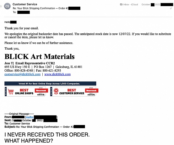 I have been ordering from Blick for a few years. When they made a mistake in my order they quickly showed their true colors as a company. Their "customer care" deptartment is nonexistent, unhelpful, and actually rude. So, the result is losing a customer, poor reviews, and spreading their poor business practice across the artist community by word of mouth. Very unfortunate that they made the choice to treat their cutomers in this manner when we have so many other online stores to choose from.