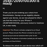 First I paid the fee to find out if it was blacklisted and it came back clean. Waited over 30 days and every time I checked it was at 99% and imminent plus it also stated 5 days and 4 hours each and every time I visited the web site. Asked for a refund and now Luke wants wants a copy of my receipt showing I paid for the phone. They had already checked the phone to see if it was blacklisted and it came back clean. Based on that info I went ahead with the unlock and now I'm out of money. Luke is a joke. He only responds after you've sent emails more than once. Save your money... Don't trust them... I will be doing more reviews at different websites and I sincerely hope they( or Luke) go out of business. See order here: Thanks for your order!