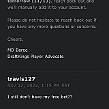 I'm going to be very honest with this review. DraftKings operates in a manner that feels very fraudulent. I opened an account in mid-October 2022. I began learning the sports betting process, particularly how to make parlay wagers. November 7th, the NBA had a rare day where all teams played. So I figured out how to place a 10 dollar 15-Leg wager that would have paid $32,000 if I won. Draft Kings immediately placed a restriction on my account and sent me an email saying I had to prove my identity and location because I had engaged in betting irregularities. I had to send them a photo of me holding my driver's license and two bank statements for two credit cards I had linked to my account. Three weeks later, account was still restricted and I could not gain access to $185 was in my account. DraftKings does not have live customer service operators. Communication is done thru email. And I sent 14 emails asking when the restriction would be lifted and only got the same auto-bot reply every time. The Chat line is the same way. This company, with its national TV ads and comedian Kevin Hart as its spokesperson is selling the public a fraudulent image. There are too many other Sportsbook companies on the market for DraftKings to be operating in such a shady manner. I contacted my state's attorney general office and forwarded them my info.