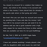 I was winning on DraftKings and cashing out like crazy, I normally use my debit card but I had exceeded the minimum for the day so I was using my daughters card, when I was loosing they had no problem with receiving funds from it but when I was hitting they locked me out and than asked for all cards banks statements and I'd and everything, than came back and said that I violated some bull$#*! but normally other casinos won't let you deposit anything without the card being in your name to being with, so they locked me out and said they have terminated my account for violating something except they also claim I forfeited all my money I had in there and also I had already pmacwd over 300.00 in bets for the superbowl and they won't refund my money they kept all my money and he clearly stated I won't get it back. Everyone needs to file a claim with the gaming commission in your area to the bull$#*! and fraud they are committing and keeping my money they ain't gona do, so since they say I violated why aren't they obligated to pay me what I donated to them in losses in the card? Bunch of pieces of $#*! scamming casino I have ever met, now they want to keep my money and the money I used to deposit it for the card they claim I violated to use that was not in my name