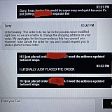 Three minutes later, I'm in a chat with Terry, who tells me my order is too far along in the process to be changed. I had just placed the order minutes ago.