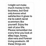 I place an aloe Vera cream form a seller but I received a sample instead of the product I ordered, I messaged the seller to ask her and she started swearing at me sending me hateful messages. She even accused me of being racist for asking her about the product and she promised to keep sending me hateful messages everyday. Her account name is nordichealth2. She is very rude and treat her customers like trash. She keeps swearing at me as i am typing this review. The worst seller I've ever experience in my life.