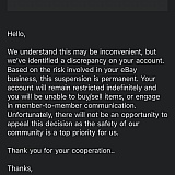 Then he threaten that future accounts that are associated with my person would be suspended as well. What did I do so wrong that made you blacklist me from ever using eBay?