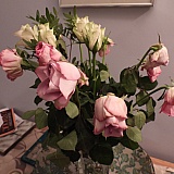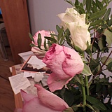 The most important point, though is the bouquet. Not in a very satisfactory state with some of the flowers beginning to wither by the end of the 14th with covering photographs taken this evening. The flowers were placed in fresh water on receipt. I would have expected that they would have lasted at least 5 days or so before any signs of deterioration. Only the white roses appear to be nearly fresh.