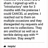Read the fine print. They make you think you can cancel but that's only for like 3 states. I paid $95 for my first installment and canceled within 3 days. When my other payments didn't go through (I canceled my card) they came after me and sent me to collections, even though I followed criteria. The matches sucked too. Scam artists.